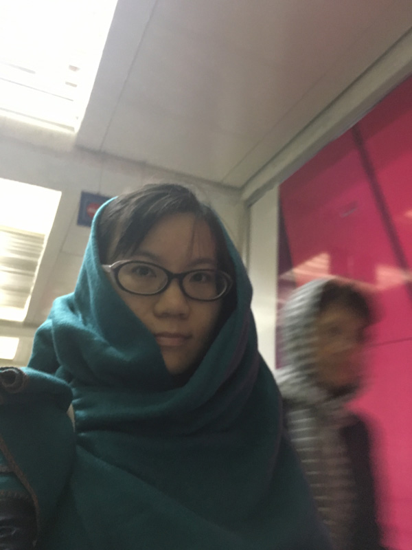 Getting off the plane wrapped in blanket cuz my scarf was checked-in