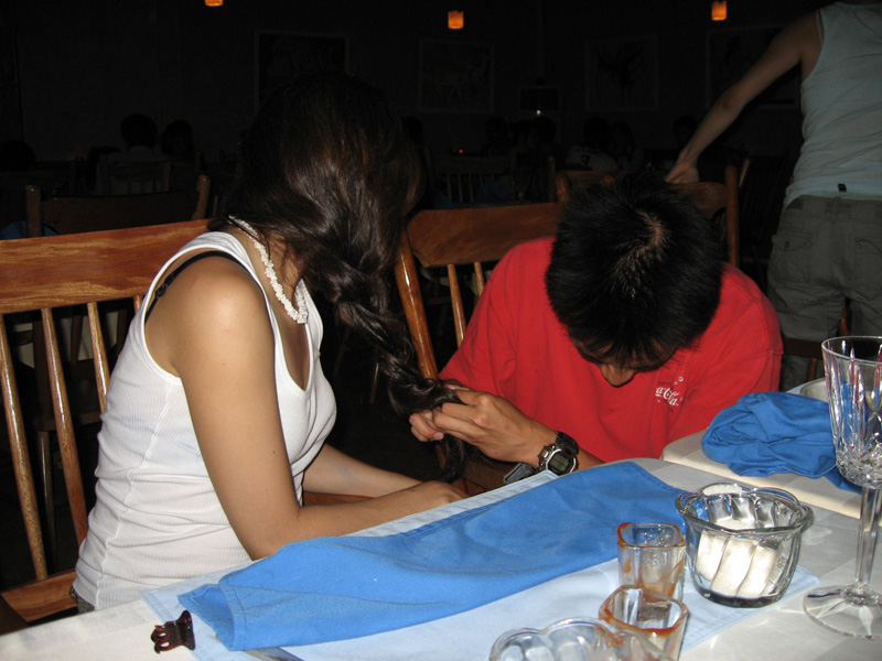 What is Harris doing to Delta*s hair?