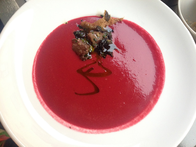 Beet root with duck heart and chicken skin soup @ LOKK